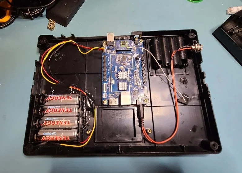 The PINE A64-LTS V2 board is attached to the case, and the battery holder is expoxied into place. I brought the 5V power line out to the side of the case where the original motherboard’s power jack was.