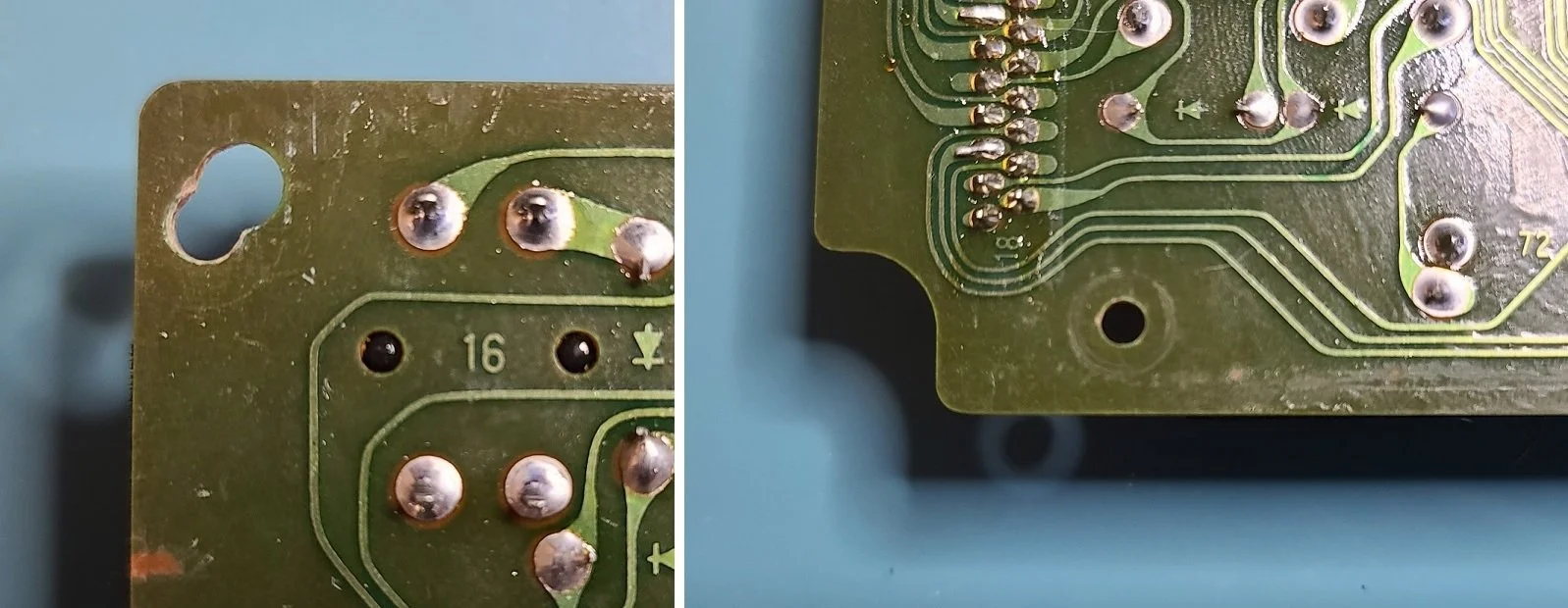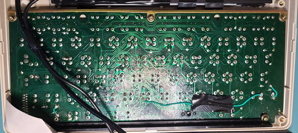This meant I had to make the 102 keyboard “compatible” with the 100 mounting arrangement, which involved drilling five holes into the PCB at the appropriate spots. Luckily the layout of traces is precisely the same between the 100 and 102 keyboards so there wasn’t any risk of harming anything important on the PCB.