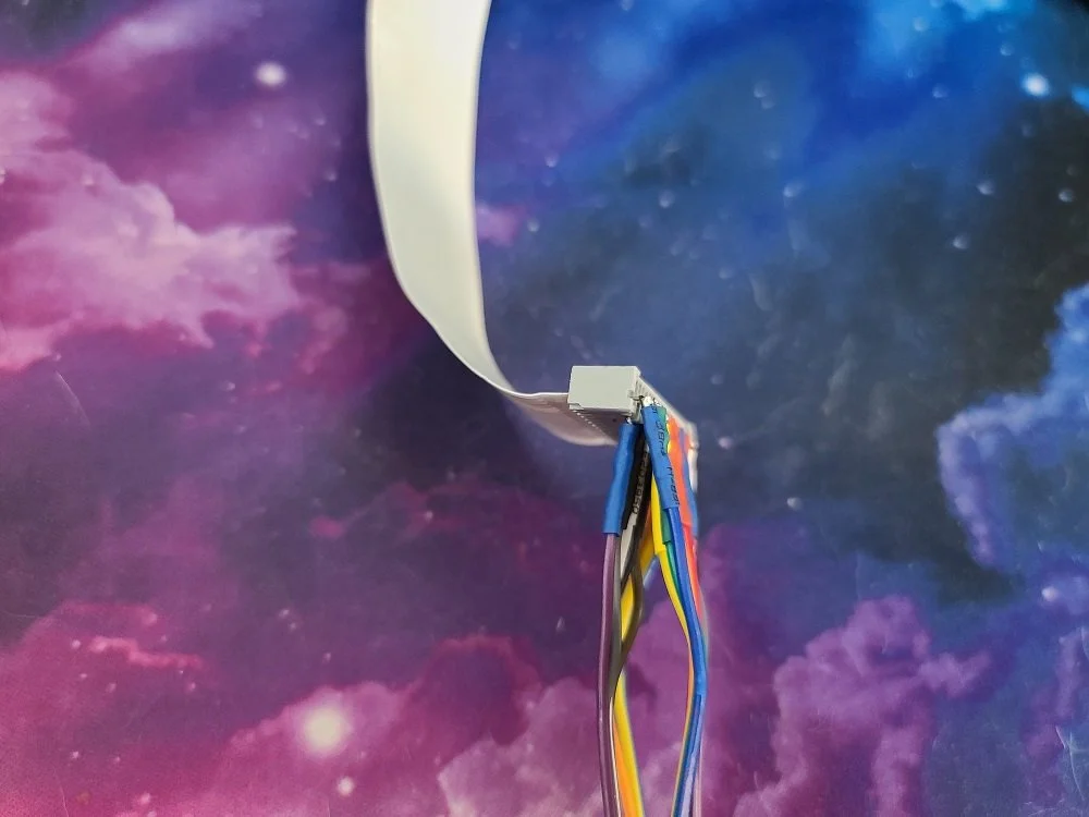 Tandy 102’s keyboard cable connected to the new connector from Mouser.com, and all 18 signals wired up to jumper wires that I’ll use for the GPIO.
