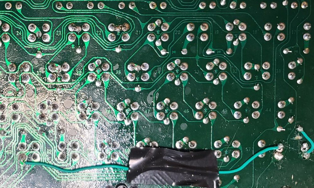 I had one Tandy 102 with a dead motherboard but had a keyboard it absolutely awesome cosmetic shape. Of all of the keyboards I could find, its key caps had the least amount of yellowing. But, a few of its keys didn’t actually work. A bit of troubleshooting with a multimeter revealed the cause to be a trace on the PCB that had been eaten by corrsion. I simply soldered in my own wire to bypass the corroded trace, and finally the keyboard was all working.